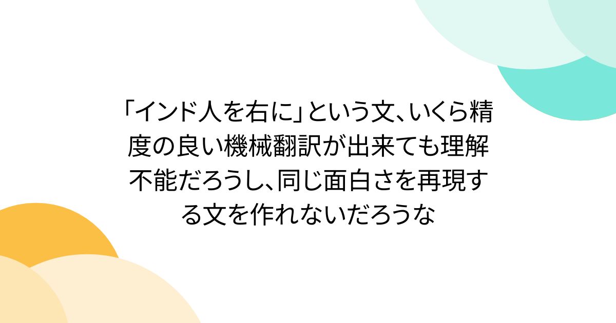 「インド人を右に」という文、いくら精度の良い機械翻訳が出来ても理解不能だろうし、同じ面白さを再現する文を作れないだろうな