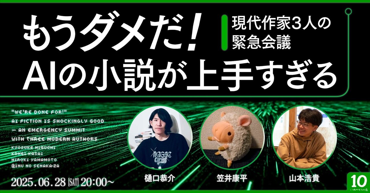 【全編公開!】もうダメだ! AIの小説が上手すぎる――現代作家3人の緊急会議|笠井康平+樋口恭介+山本浩貴(いぬのせなか座)|いぬのせなか座