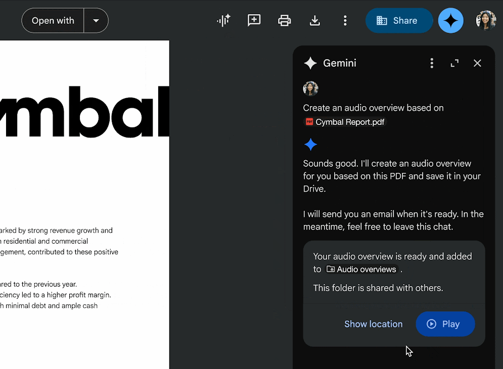 「Google ドライブ」のGeminiにPDFから音声概要を生成する機能が追加/ポッドキャスト風の会話音声で内容を説明、「NotebookLM」の人気機能を移植