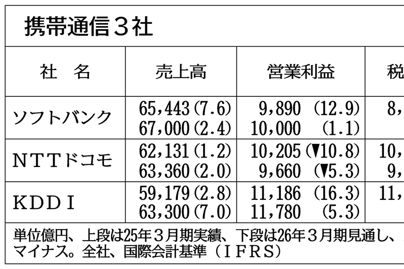 携帯3社の通期見通し、2社営業増益 通信料上げ収益改善
