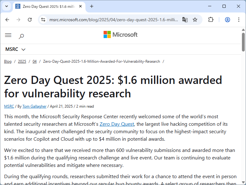 Microsoft、ハッキングイベント「Zero Day Quest」を初開催。支払った報奨金は2億円/今後は毎年開催へ