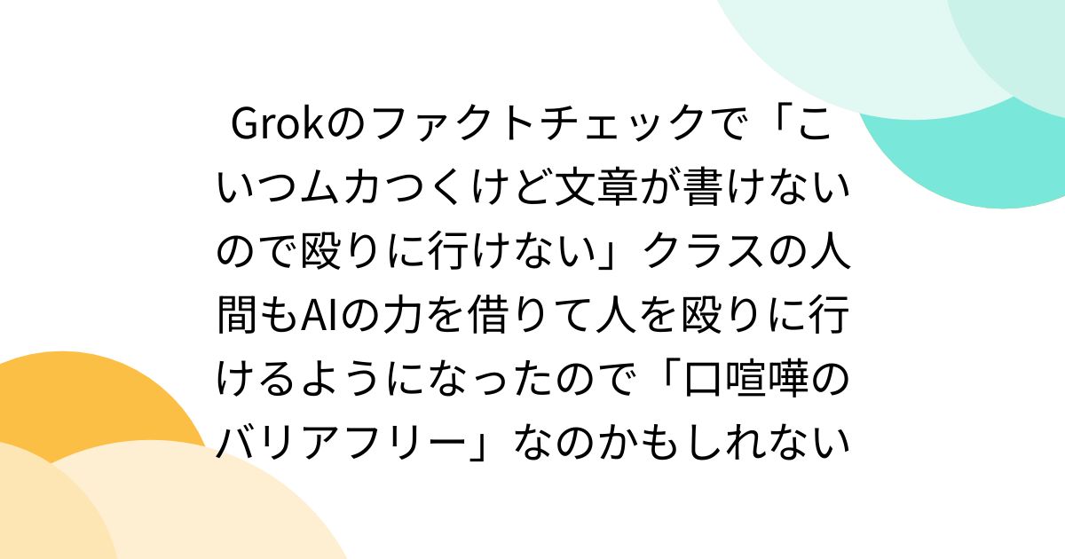 Grokのファクトチェックで「こいつムカつくけど文章が書けないので殴りに行けない」クラスの人間もAIの力を借りて人を殴りに行けるようになったので「口喧嘩のバリアフリー」なのかもしれない
