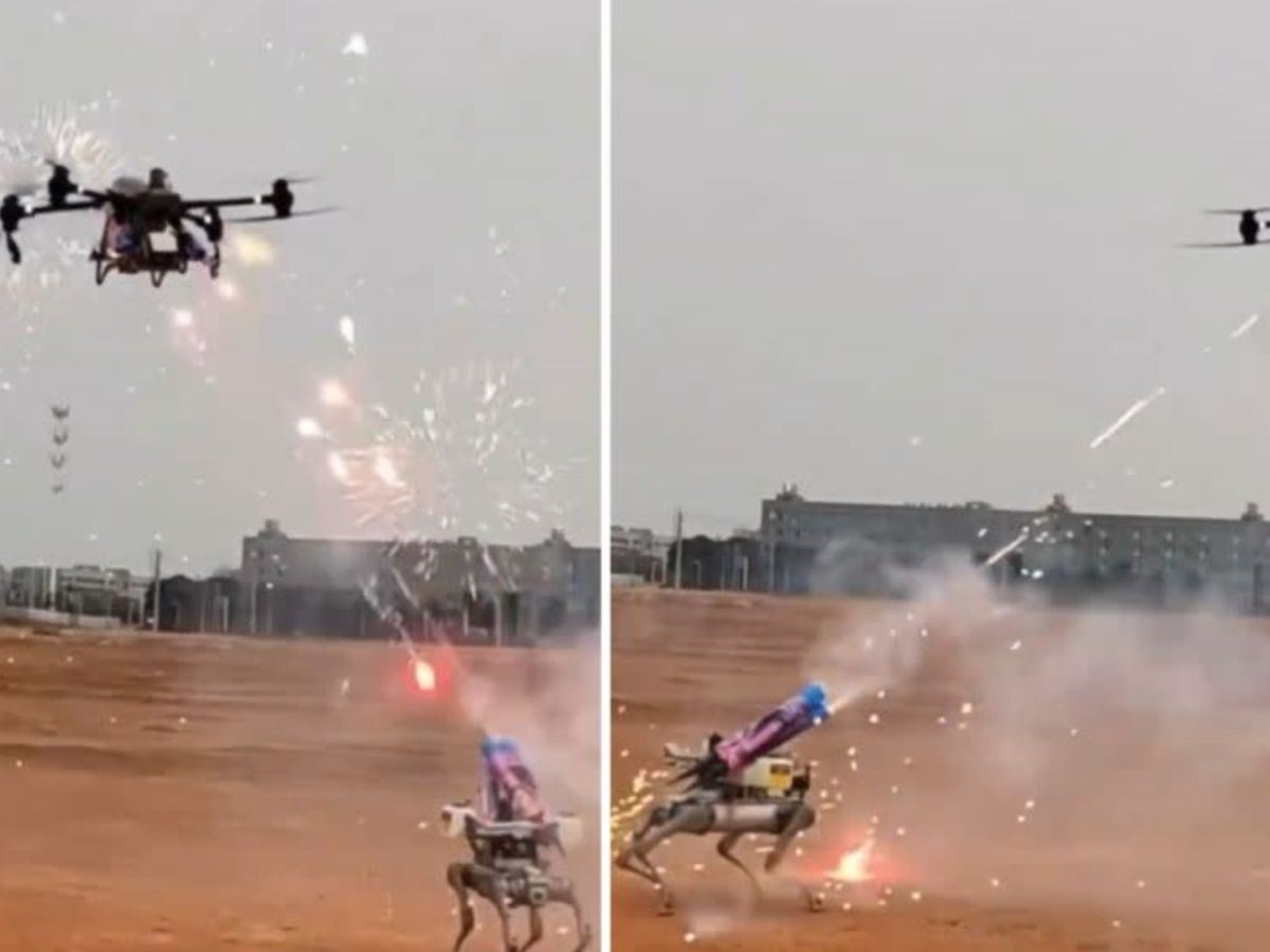 ロボット犬 vs ドローン、花火合戦が未来の戦争を予見? スカイネットは現実になるのか