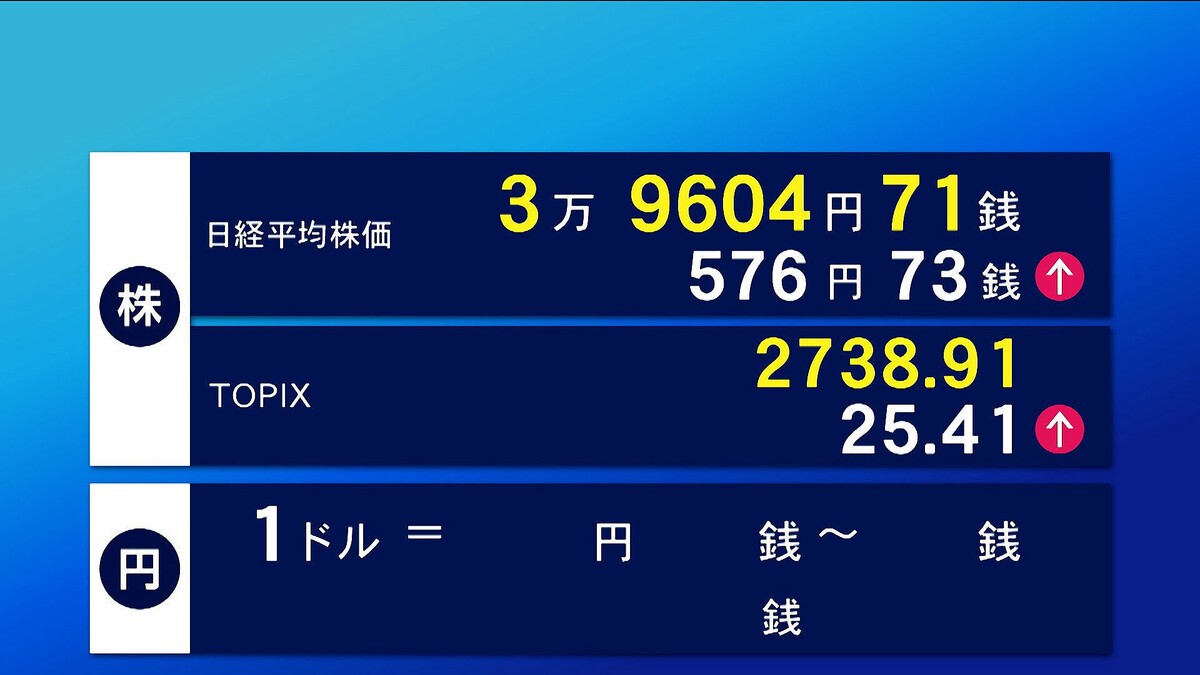 日経平均株価が一時600円以上値上がり 576円73銭高の3万9604円71銭で終了