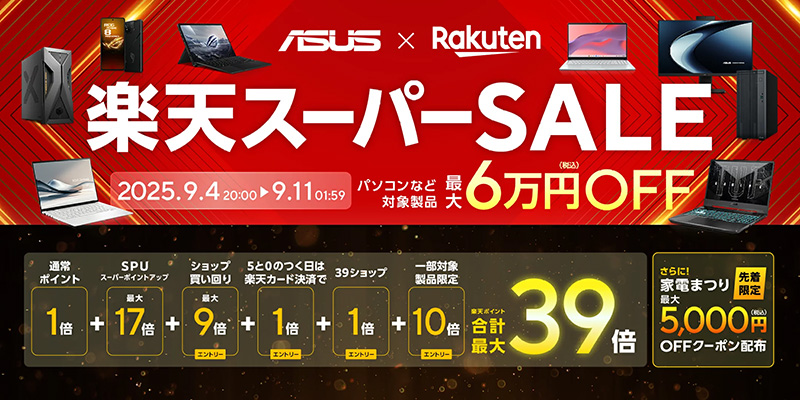 ASUSのゲーミングPCやAIノートPC、ゲーミングスマホが最大6万円オフ!楽天スーパーSALE