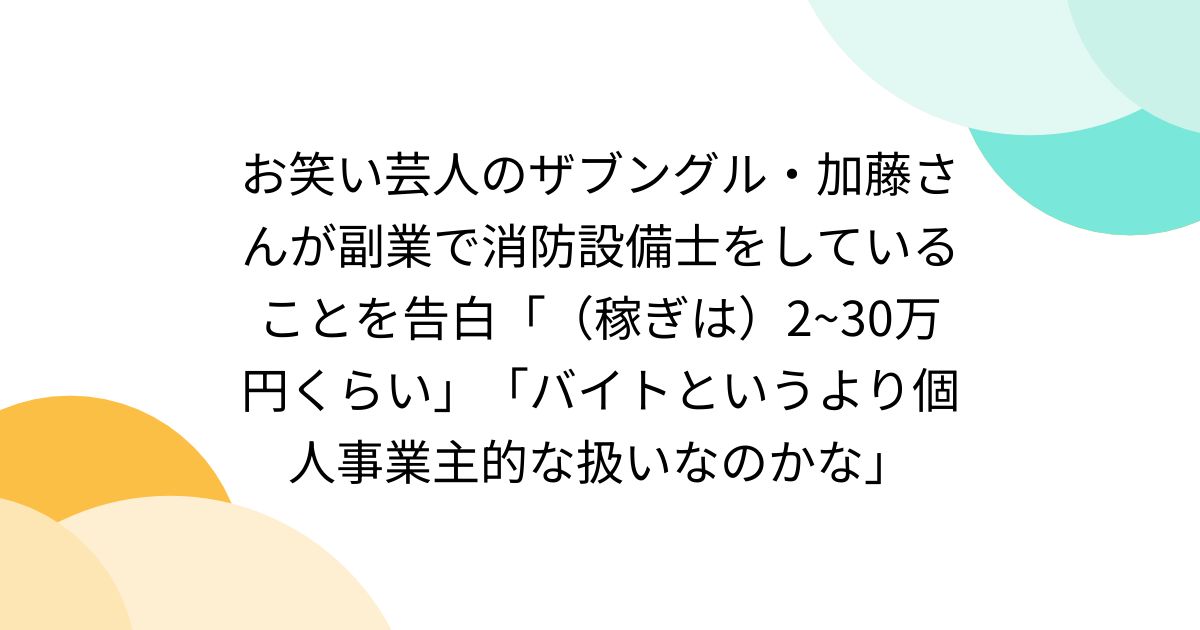 お笑い芸人のザブングル・加藤さんが副業で消防設備士をしていることを告白「(稼ぎは)2~30万円くらい」「バイトというより個人事業主的な扱いなのかな」