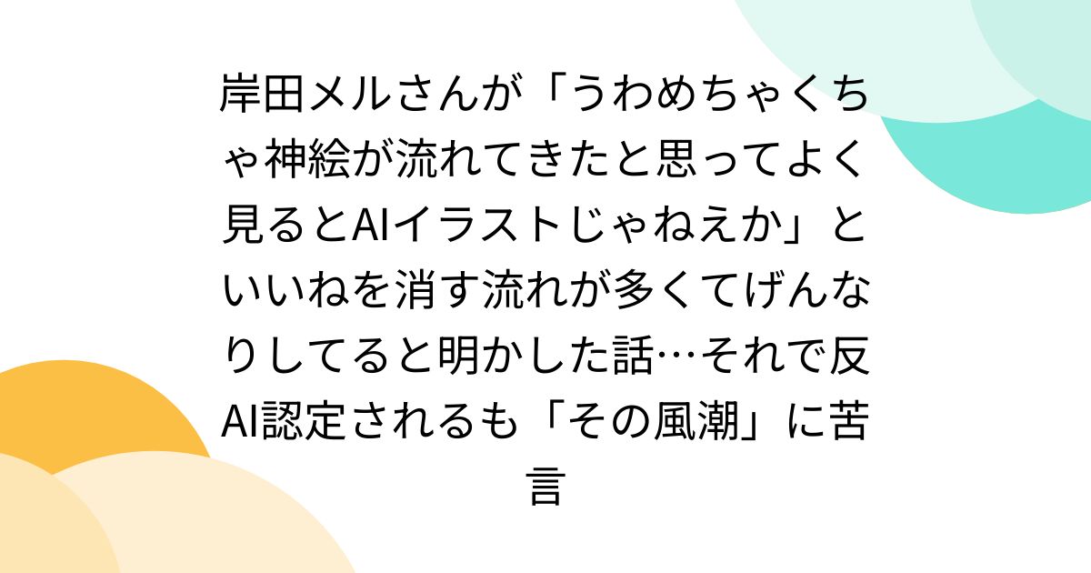 岸田メルさんが「うわめちゃくちゃ神絵が流れてきたと思ってよく見るとAIイラストじゃねえか」といいねを消す流れが多くてげんなりしてると明かした話…それで反AI認定されるも「その風潮」に苦言