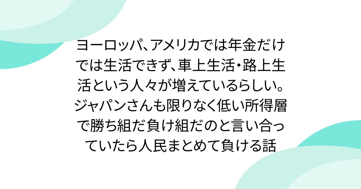 ヨーロッパ、アメリカでは年金だけでは生活できず、車上生活・路上生活という人々が増えているらしい。ジャパンさんも限りなく低い所得層で勝ち組だ負け組だのと言い合っていたら人民まとめて負ける話