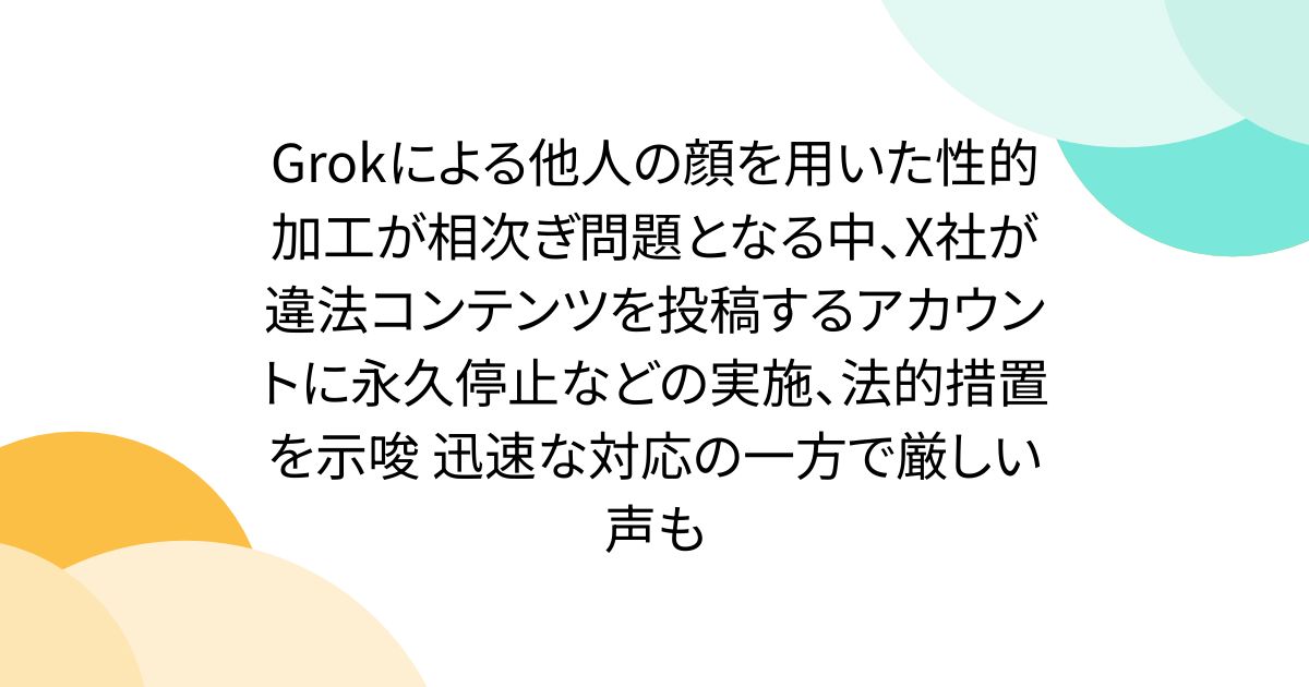 Grokによる他人の顔を用いた性的加工が相次ぎ問題となる中、X社が違法コンテンツを投稿するアカウントに永久停止などの実施、法的措置を示唆 迅速な対応の一方で厳しい声も