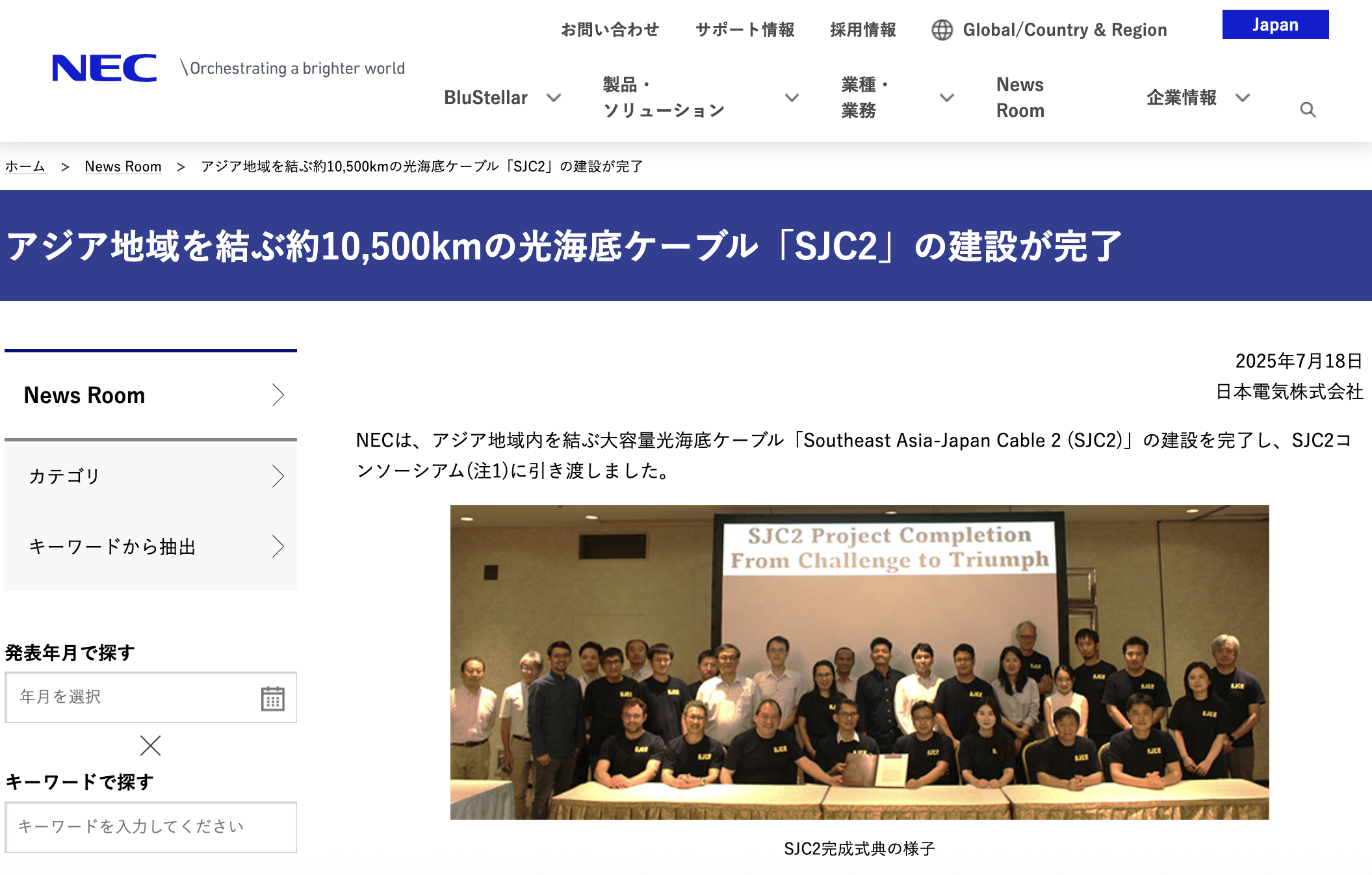NEC、アジア地域内約1万500kmを結ぶ大容量光海底ケーブル「SJC2」を建設 AI普及などにより広い帯域幅の通信需要に応える