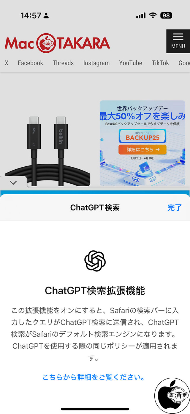 Safariの検索バーからChatGPT検索が利用可能に