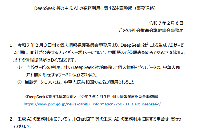 デジタル庁デジタル社会推進会議幹事会、DeepSeekなどの業務利用に注意喚起