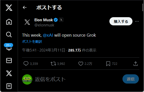 Xの生成AI「Grok」、今週オープンソース化 マスク氏が投稿