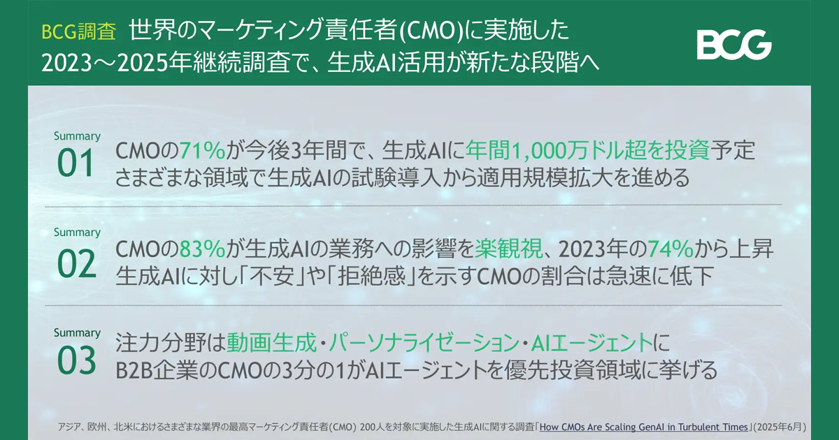 世界のCMOのうち71%が今後3年間、生成AIに年間1,000万ドル超を投資【BCG調査】