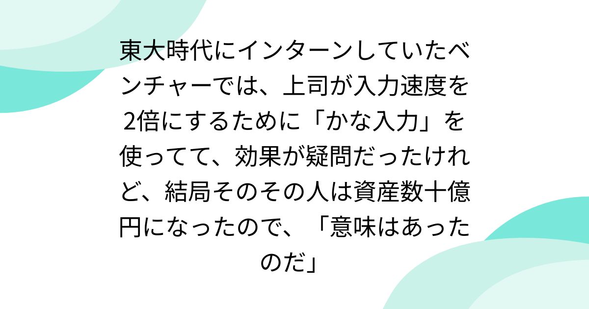 東大時代にインターンしていたベンチャーでは、上司が入力速度を2倍にするために「かな入力」を使ってて、効果が疑問だったけれど、結局そのその人は資産数十億円になったので、「意味はあったのだ」